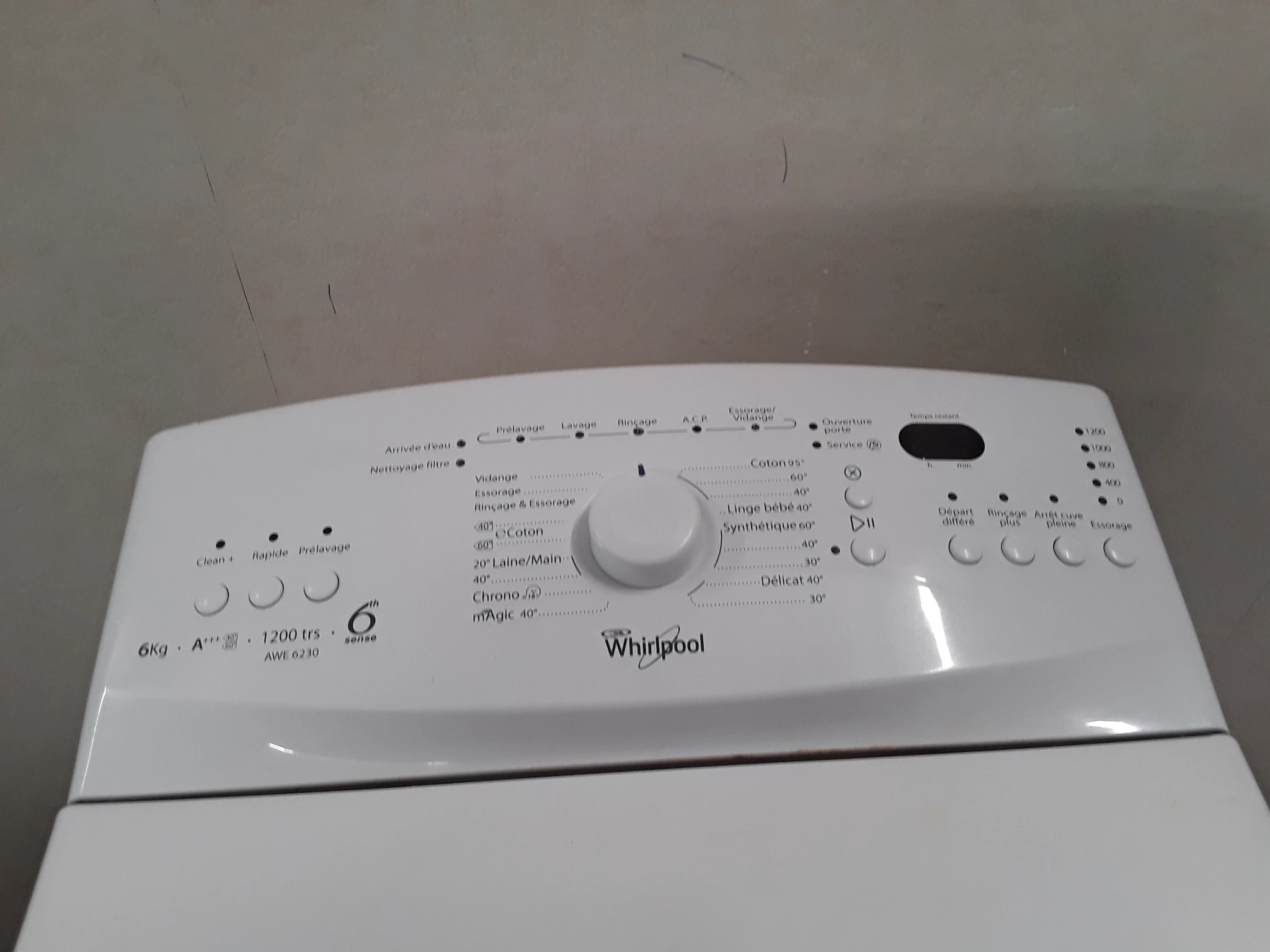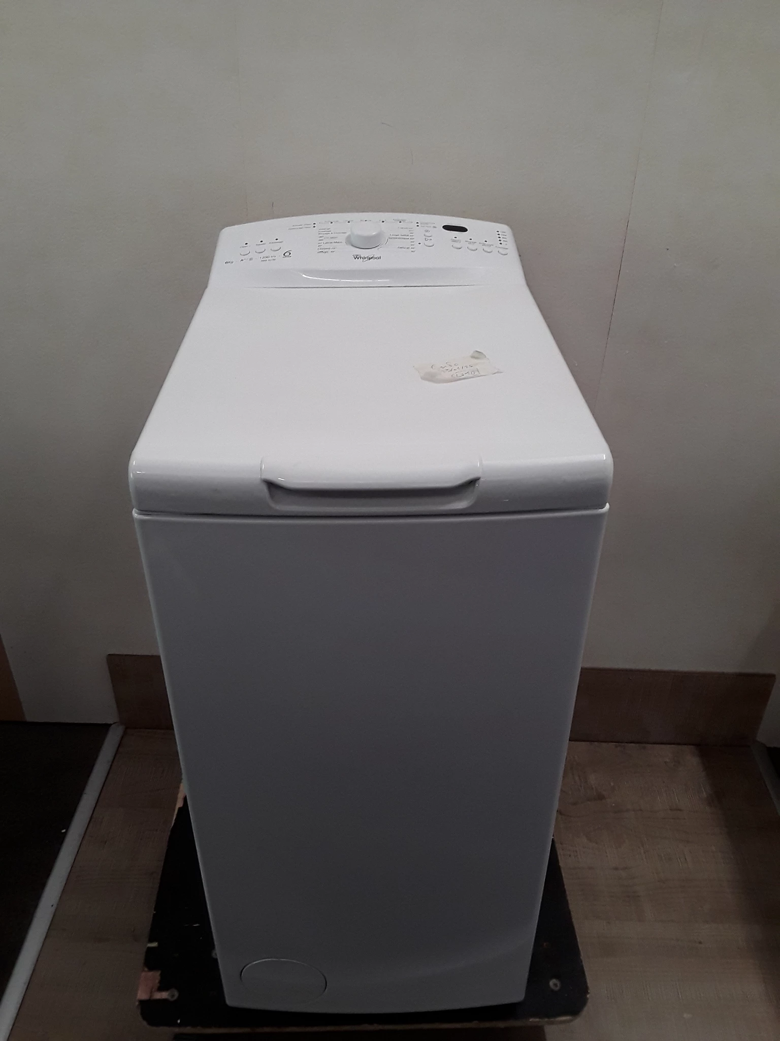 Lave-linge Top blanc Whirlpool – 6kg – 2300W – Energie A+++ – 76dB – très bon état. – Appareil reconditionné par La Boîte à Utiles. Garantie: 12 mois