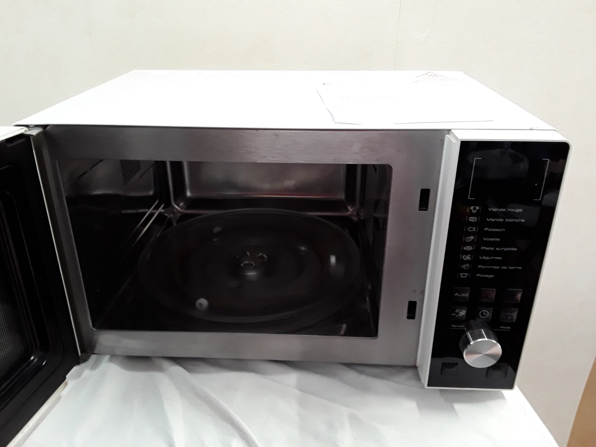 Micro-ondes grill pose-libre Blanc et noir Brandt – 26L – 900W – très bon état. petit impact sur le dessus. – Appareil reconditionné par La Boîte à Utiles. Garantie: 6 mois